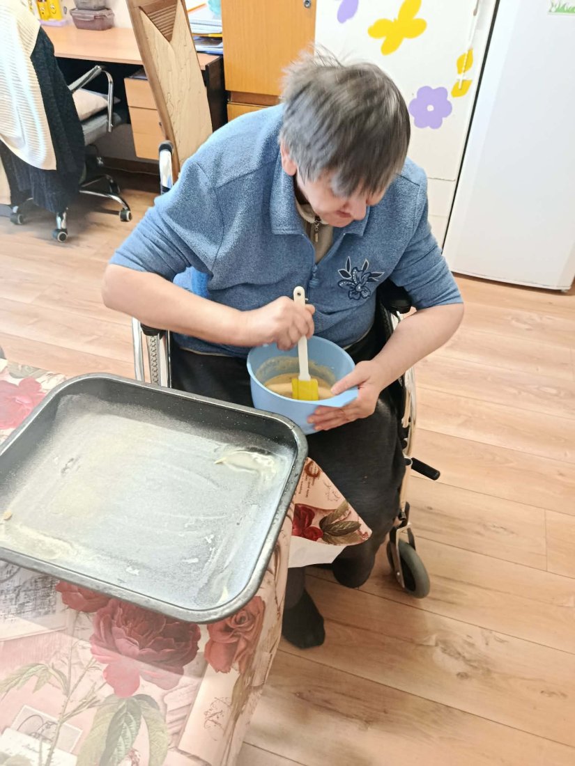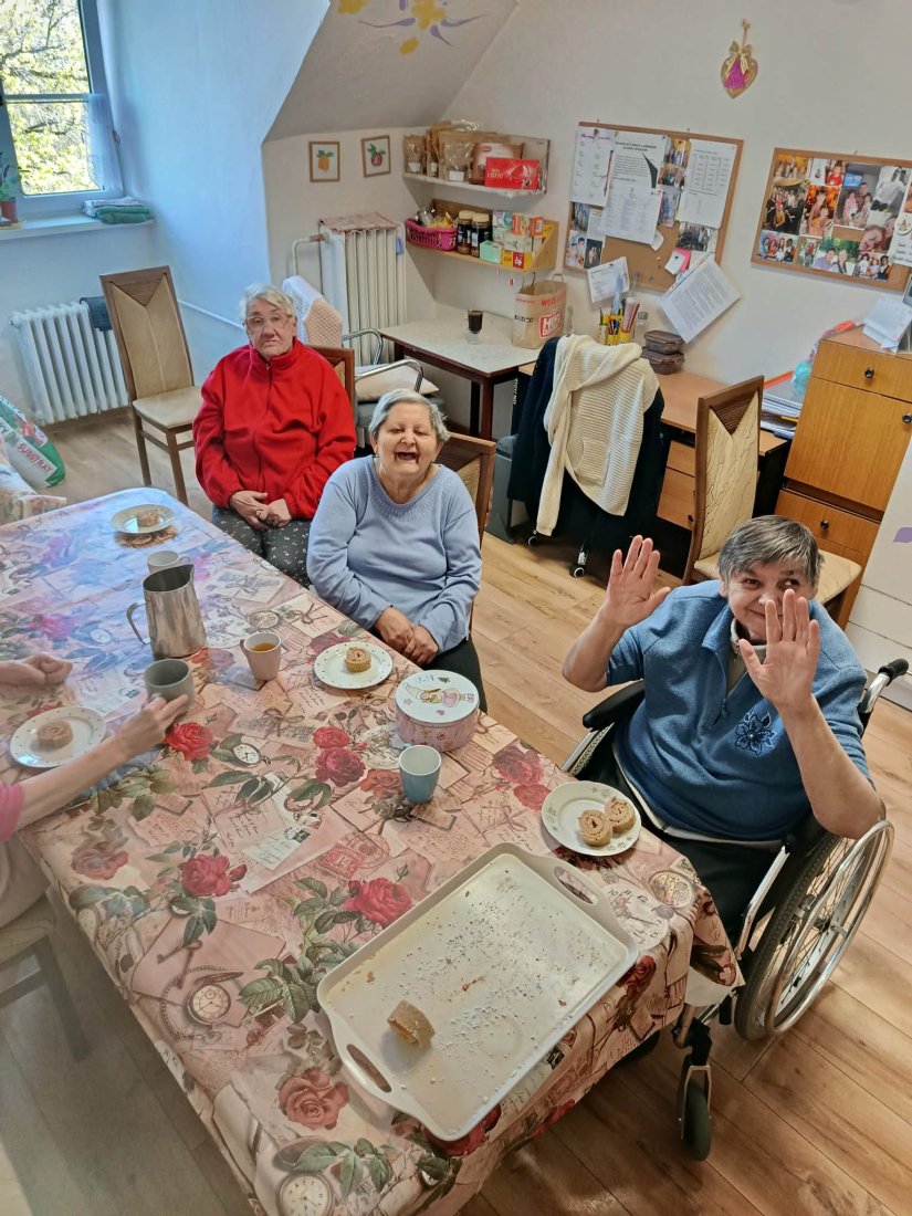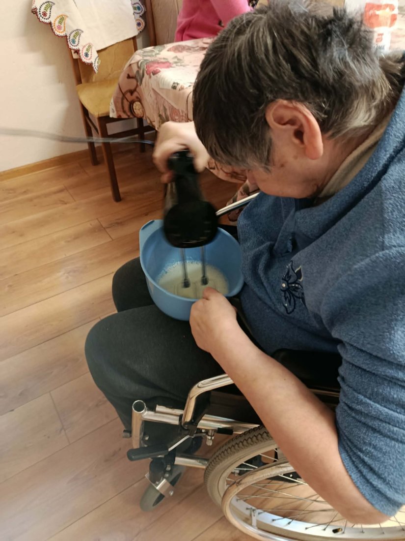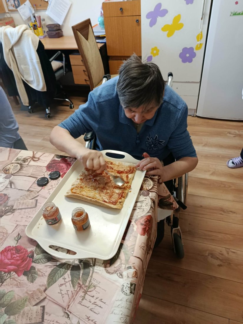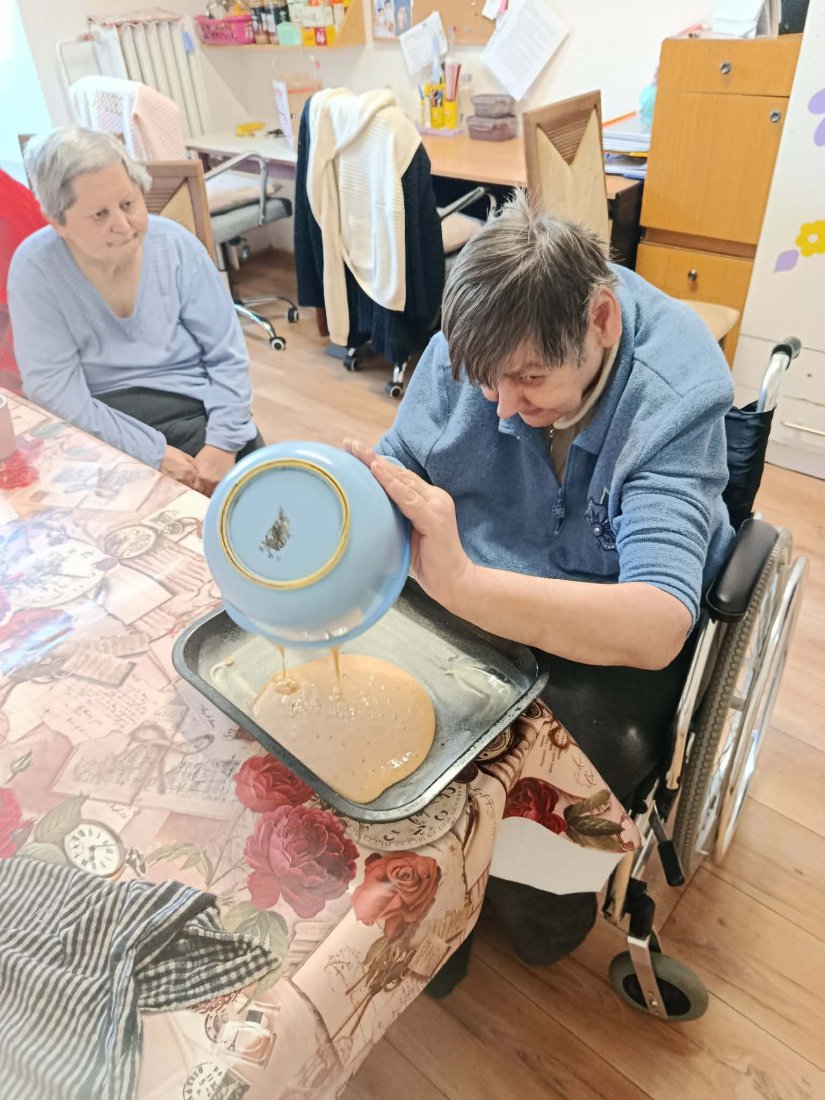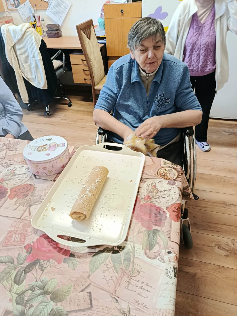 Vôňa domova zavítala na ležiace oddelenie. Naše prijímateľky sa s chuťou pustili do pečenia lekvárovej rolády pod vedením inštruktorky sociálnej rehabilitácie. Pri spoločnom natieraní a rolovaní cesta si nielen precvičili jemnú motoriku, ale predovšetkým oživili spomienky a spríjemnili si deň srdečným rozhovorom.